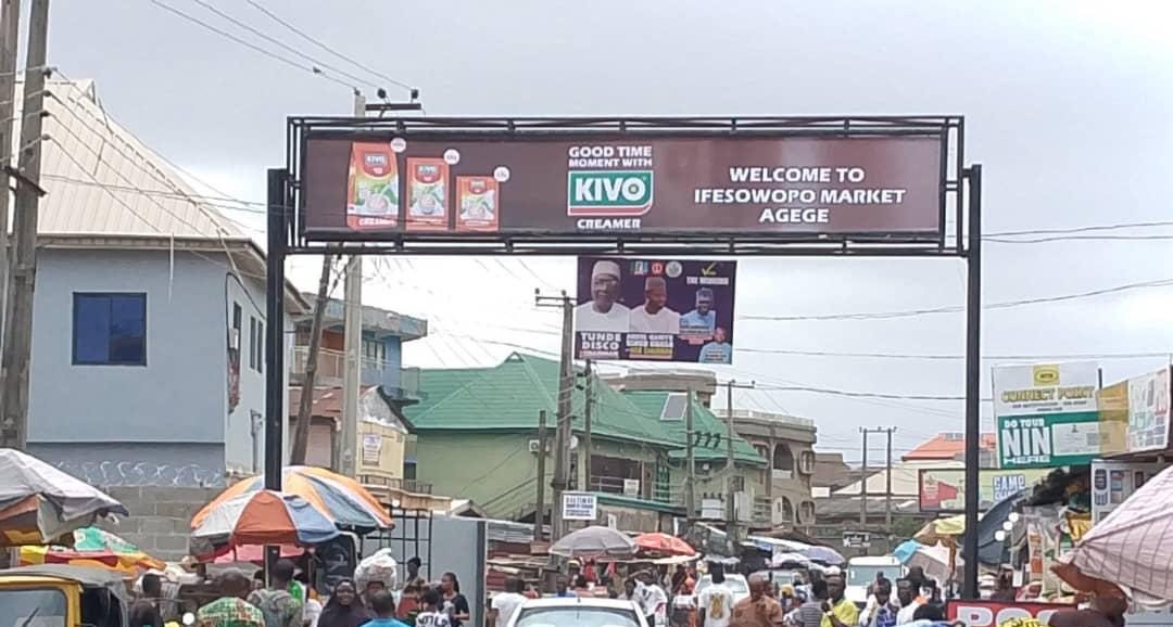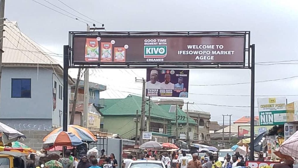 Double face entrance arcade static gantry board at IFESOWAPO Agege Market by royal stream filling station .